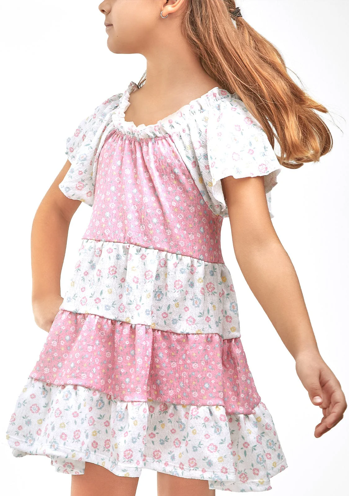 This floral dress has ruffles in different colours printed with flowers reminiscent of spring. It has a round neck with a rubberised finish and short sleeves for freshness.