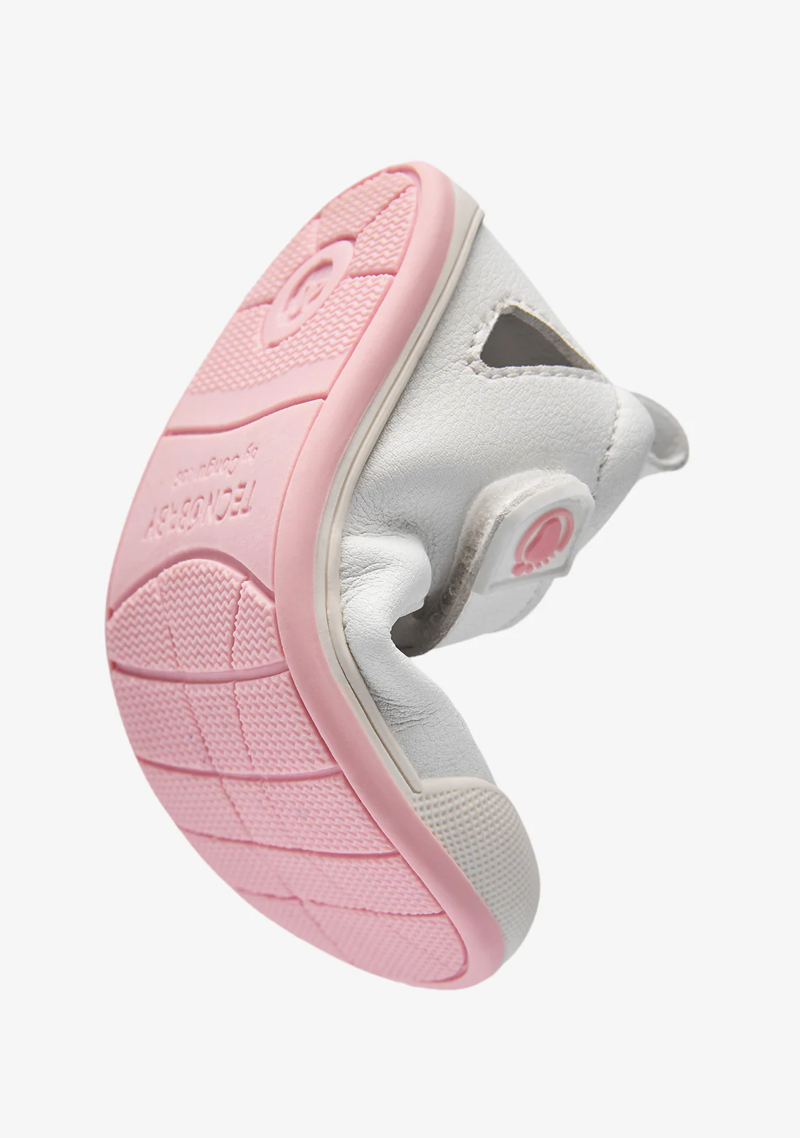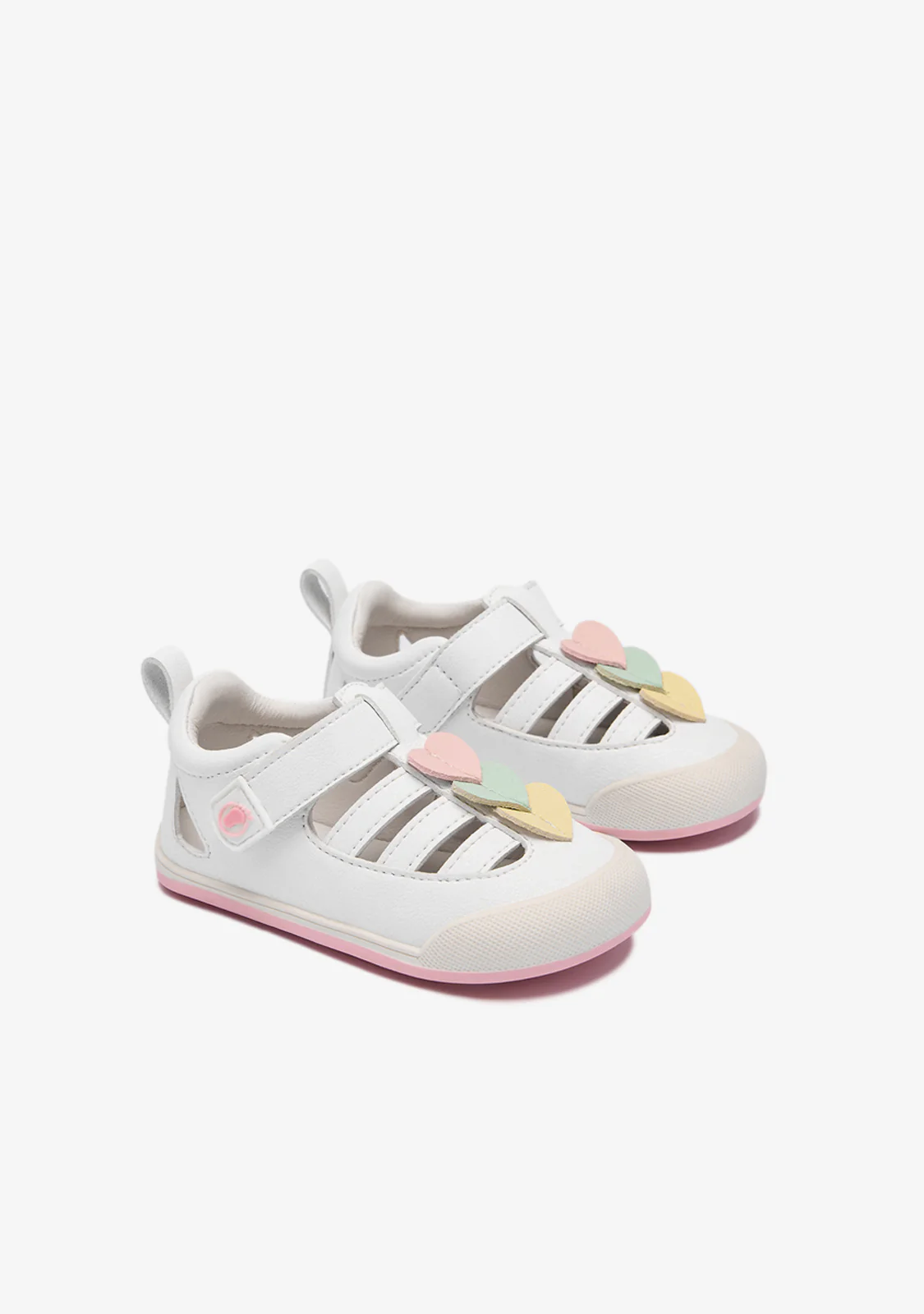 Closed white barefoot sandals with a multicolored heart detail, designed to accompany everyday adventures during the warmer months. Their design combines the protection of a closed toe with side openings that enhance breathability, keeping feet cool and comfortable, with a fun touch.